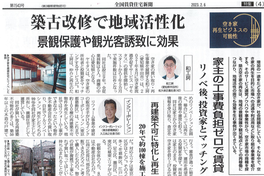 全国賃貸住宅新聞(2023年2月6日)築古改修で地域活性化 |